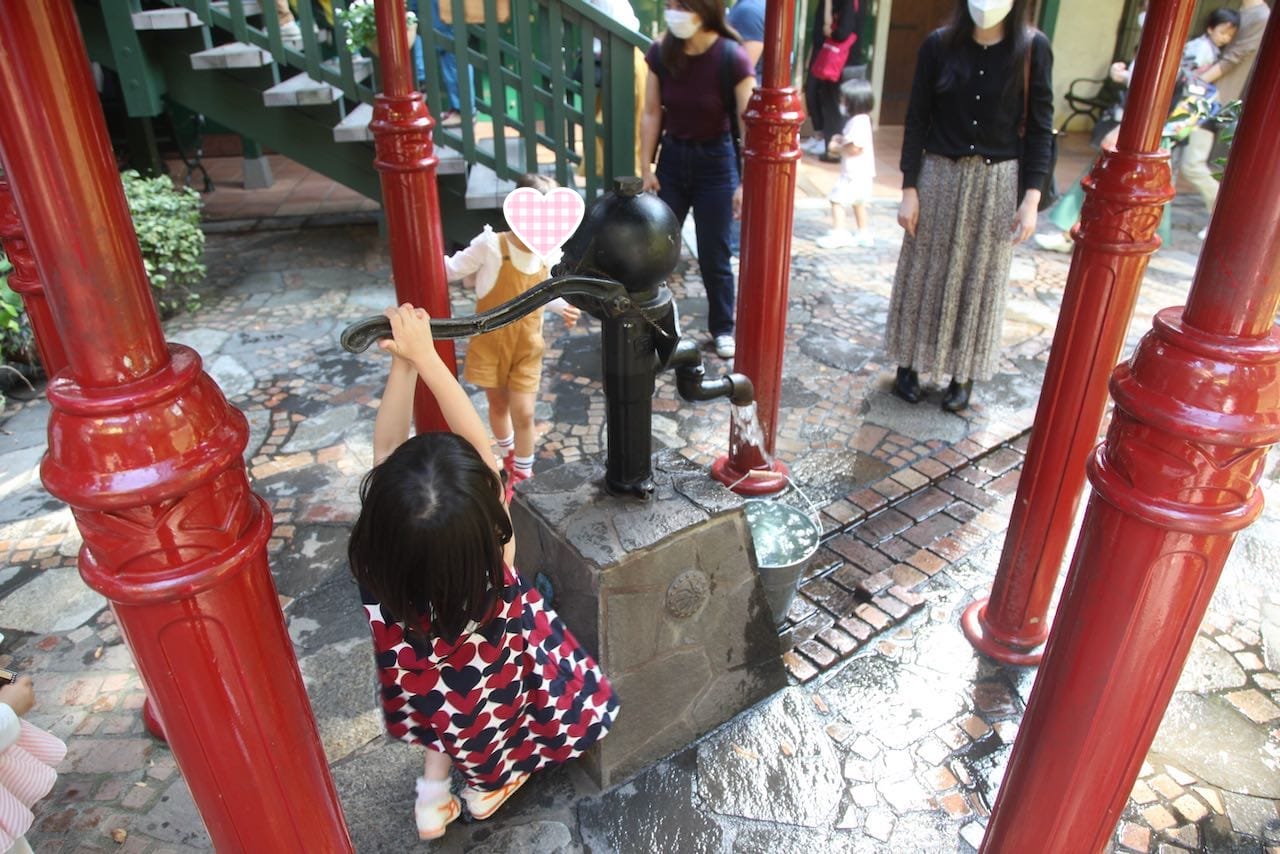 場所は館内地下1Fの中庭スペースになります。都内ではほとんど見ることができない手漕ぎポンプ。娘もトトロのワンシーン同様、必死にポンプを引いてました。