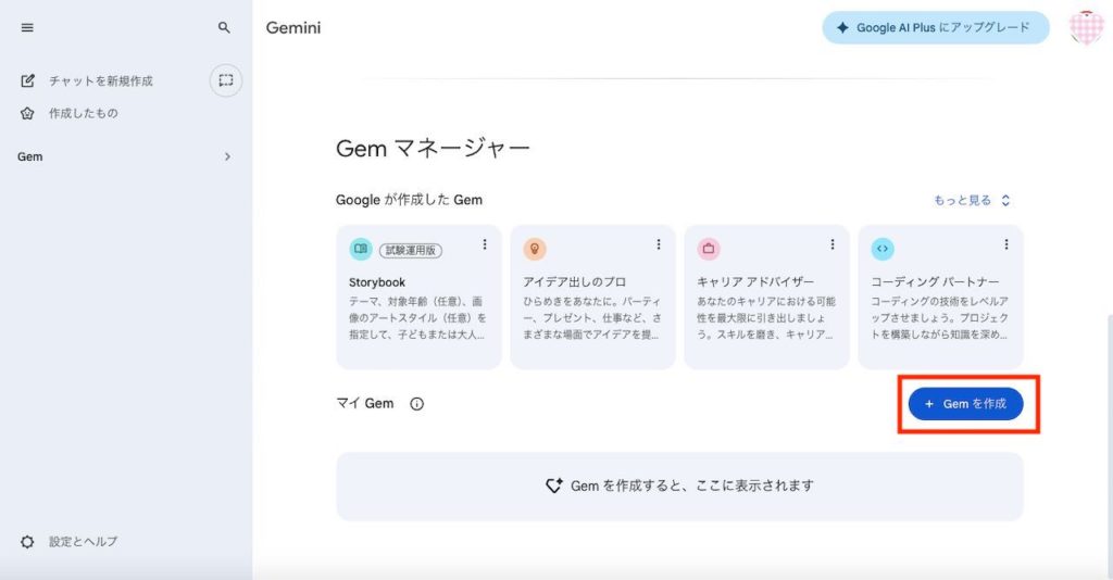 少し下にスクロールし、「+Gemを作成」をクリックします