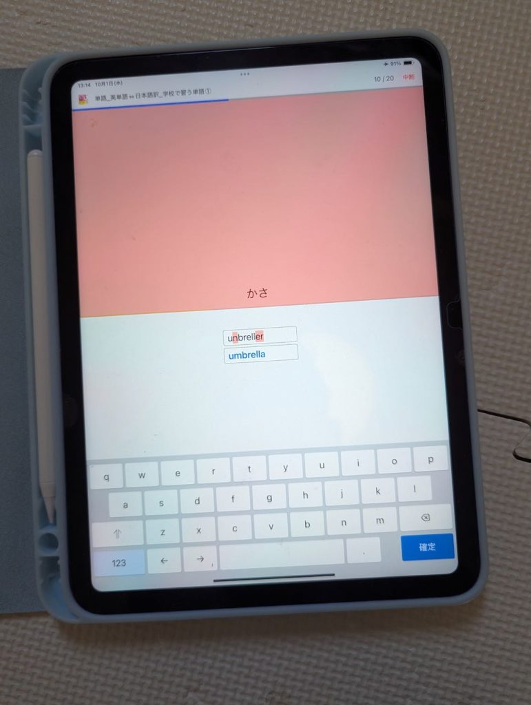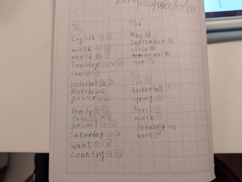 朝、1回(20問)を10分、覚えられなかった単語を親がノート書いておき、スペルを覚えさせます(5分〜10分)。