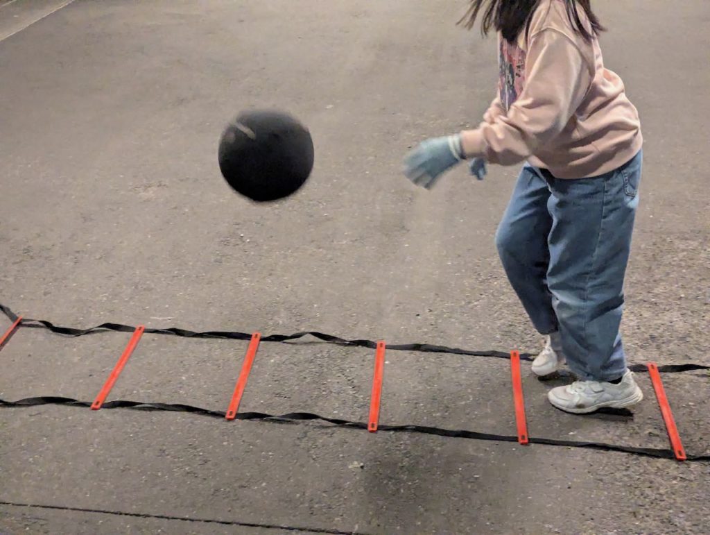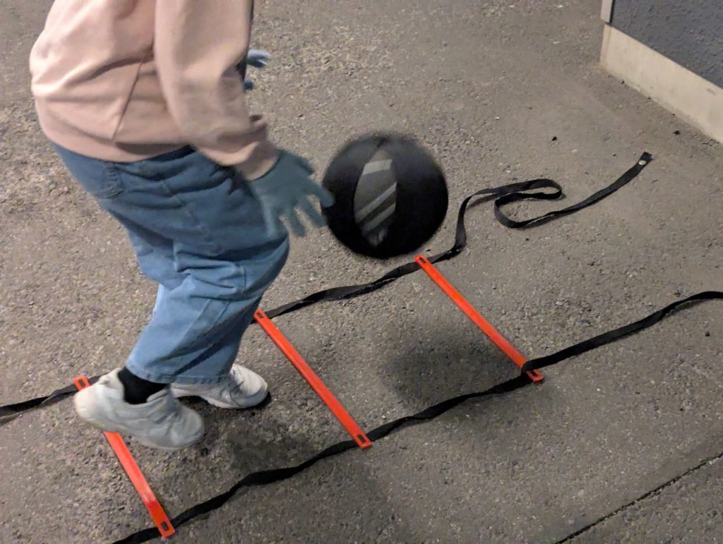 最初は「slippery socks」の滑りやすさに苦戦し、足と手の動きがバラバラでしたが、1ヶ月もすると驚くほどスムーズに。 ※ラダー練習の詳細はでも紹介しています。